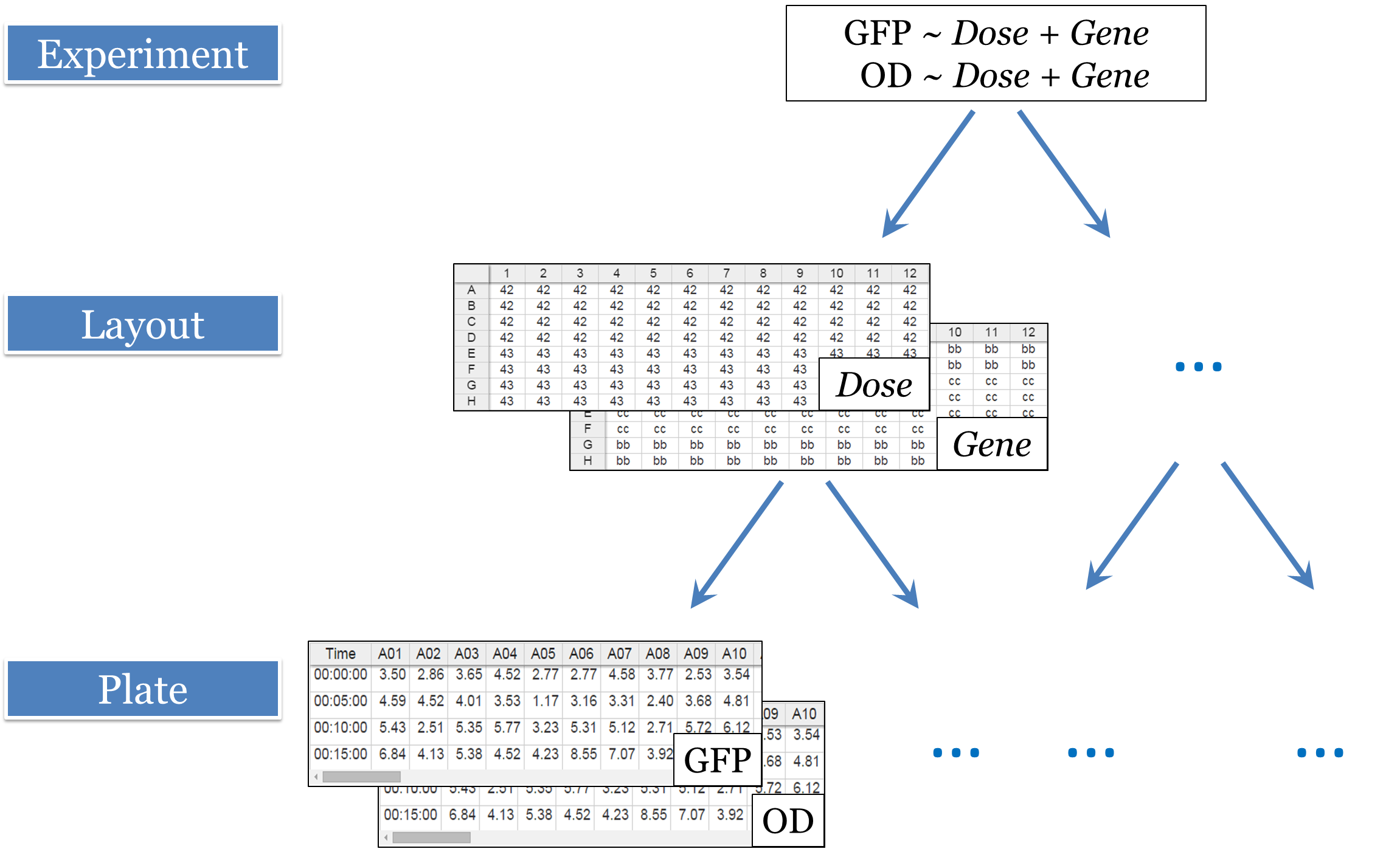A single experiment aims to answer one question: how different factors (independent variables) influence channels (dependent variables). The experiment information consists experiment name, user and number of wells for microplates, as well as meta information about factors and channels.